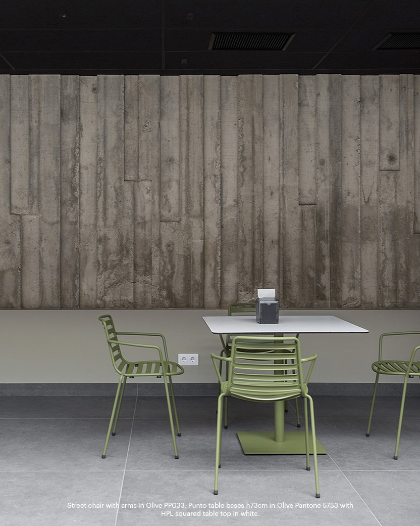 Enea's furniture has played a key role both indoors and outdoors. In the outdoor areas, Street chairs, Coma stools, and Punto table bases have been incorporated.