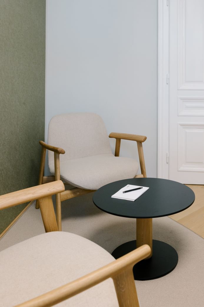 In the waiting area, two Ekuru lounge chairs and a Taber side table create a cozy and elegant composition, perfect for offering a warm welcome. The choice of colors and shapes reinforces the visual identity of the space, adding character without compromising functionality.